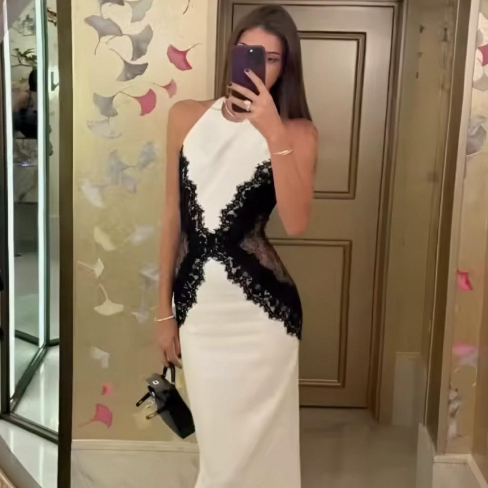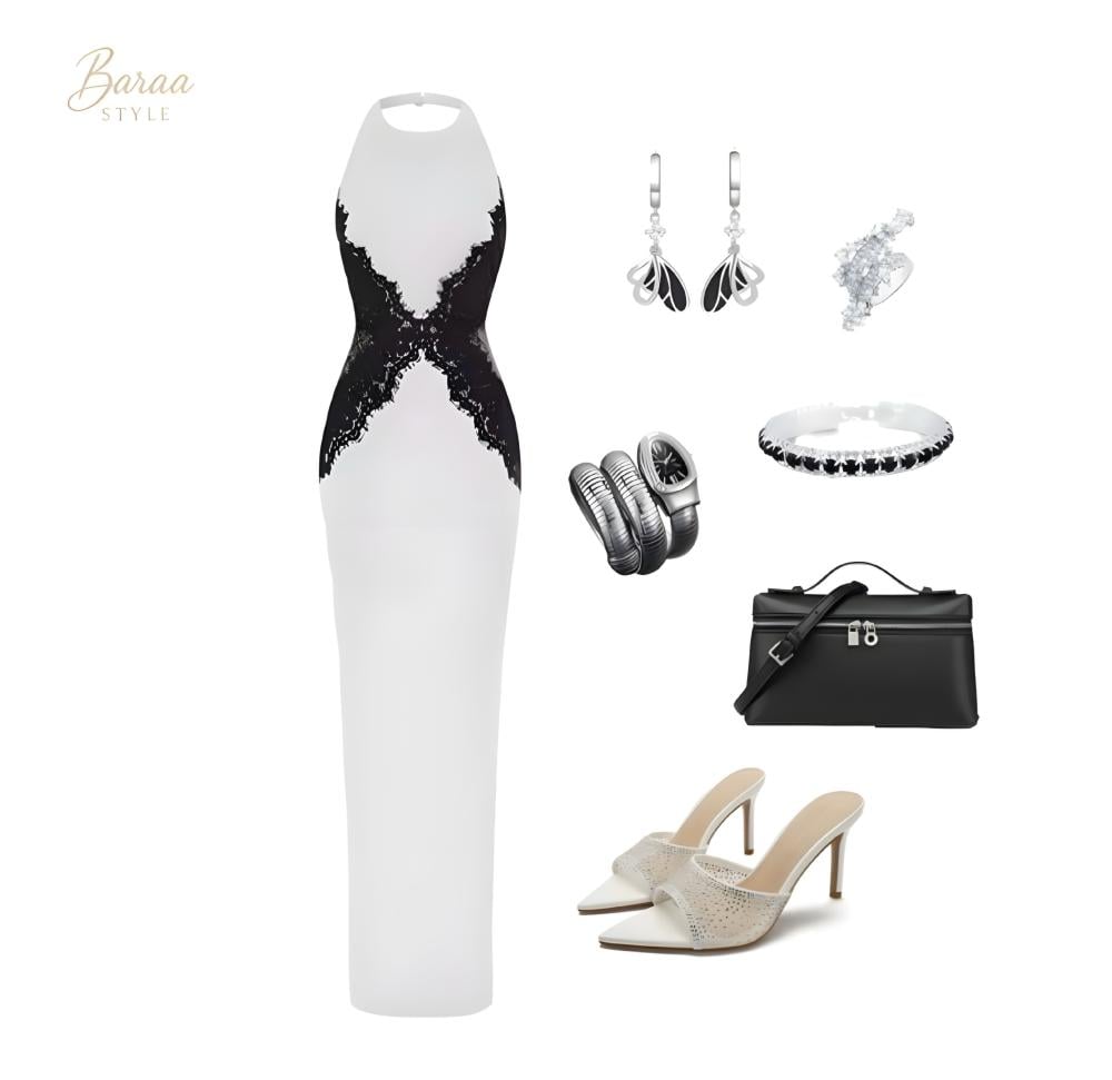 فستان أبيض طويل بتفاصيل دانتيل أسود تبرز جمال القوام، منسّق مع شنطة يد جلدية فاخرة وكعب أسود أنثوي بالدانتيل. أضفنا لمسة تألق بـ أقراط راقية، ساعة ملتفّة أنيقة، خاتم لامع، وسوار أنيق، لتكوني بكامل أناقتك في السهرات والمناسبات الفخمة.