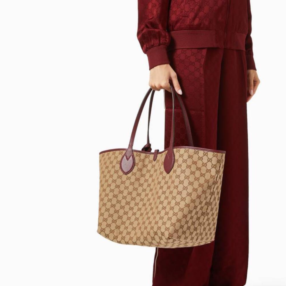 شنطة أنيقة من غوتشي، مصنوعة من جلد طبيعي بلون عنّابي جذّاب، بتصميم بسيط وراقي يعبّر عن الفخامة الهادئة. تجمع بين العملية والرقي بسعة واسعة تناسب يومك بالكامل – من دوامك الصباحي إلى طلعاتك المسائية. مثالية للمرأة العصرية اللي تحب تجمع بين الأناقة والراحة في كل خطوة